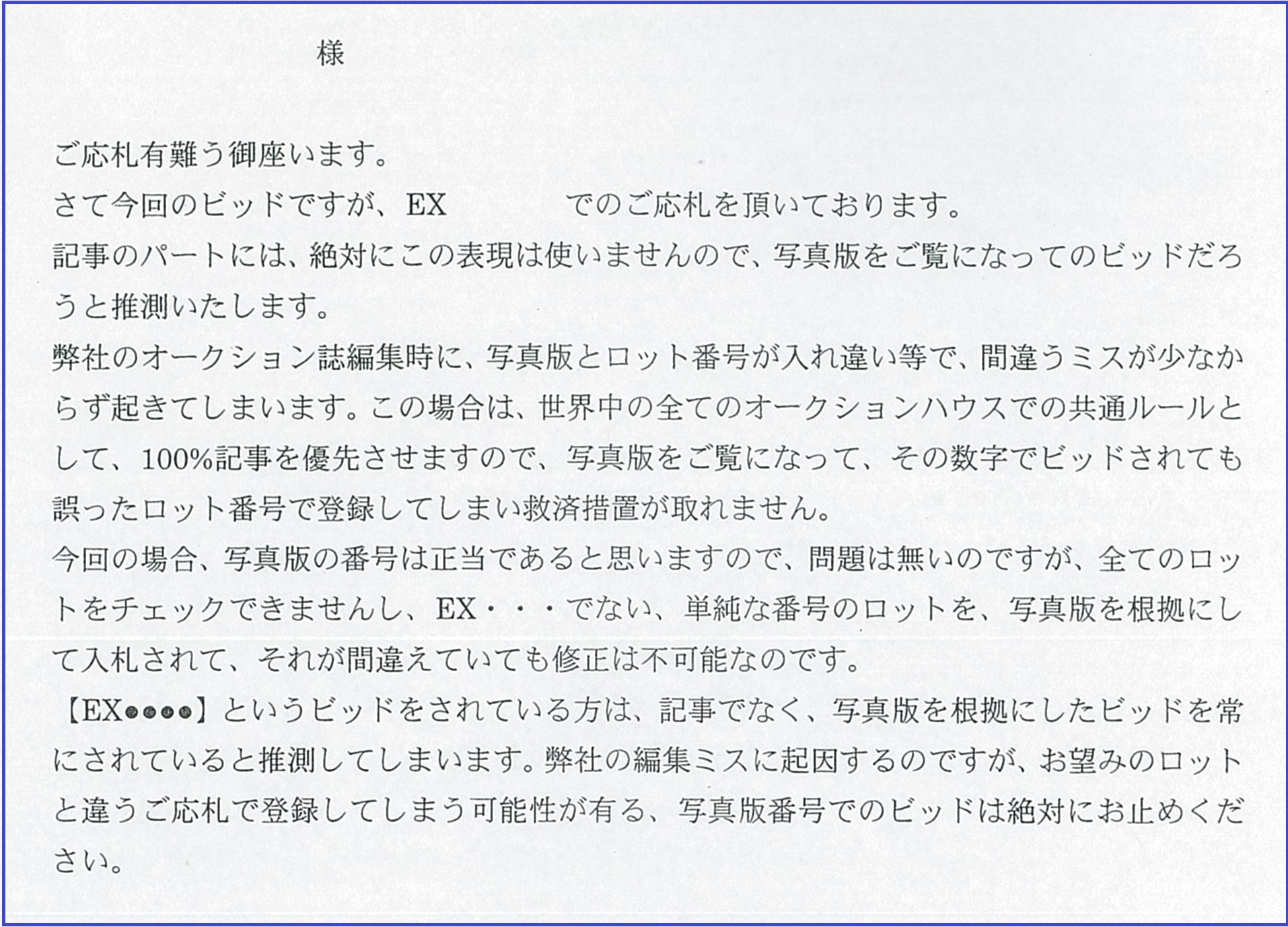 弊社の写真版で、EX〇〇〇〇の表示をよく使います。EXは、EXampleの省略形で、一例の意味です。複数枚のロットの一部を抜き出して写真版に載せているのです。この事は殆どの方が理解されているはずです。でも、セールに於いては、EX〇〇〇〇という符号は入札に用いるべき番号では無いのです。毎回数名の方が、この符号でビッドをされています。弊社がビッドを登録する際には、EXを外します。一般的にはそれで問題は無い筈ですが、今回のように記事と写真の番号が相違した場合に困ったことが起きるのです。ビッドされる方には何の悪意は無いのですが、EX・・・ビッドは、写真版を根拠にしてのビッドだと判断せざるを得ないのです。そして、もし写真版の番号が間違えていても救済の手段が有りません。だから、EX・・・のビッドをされた方には注意書きのメモを送ります。ここに載せておきます。
